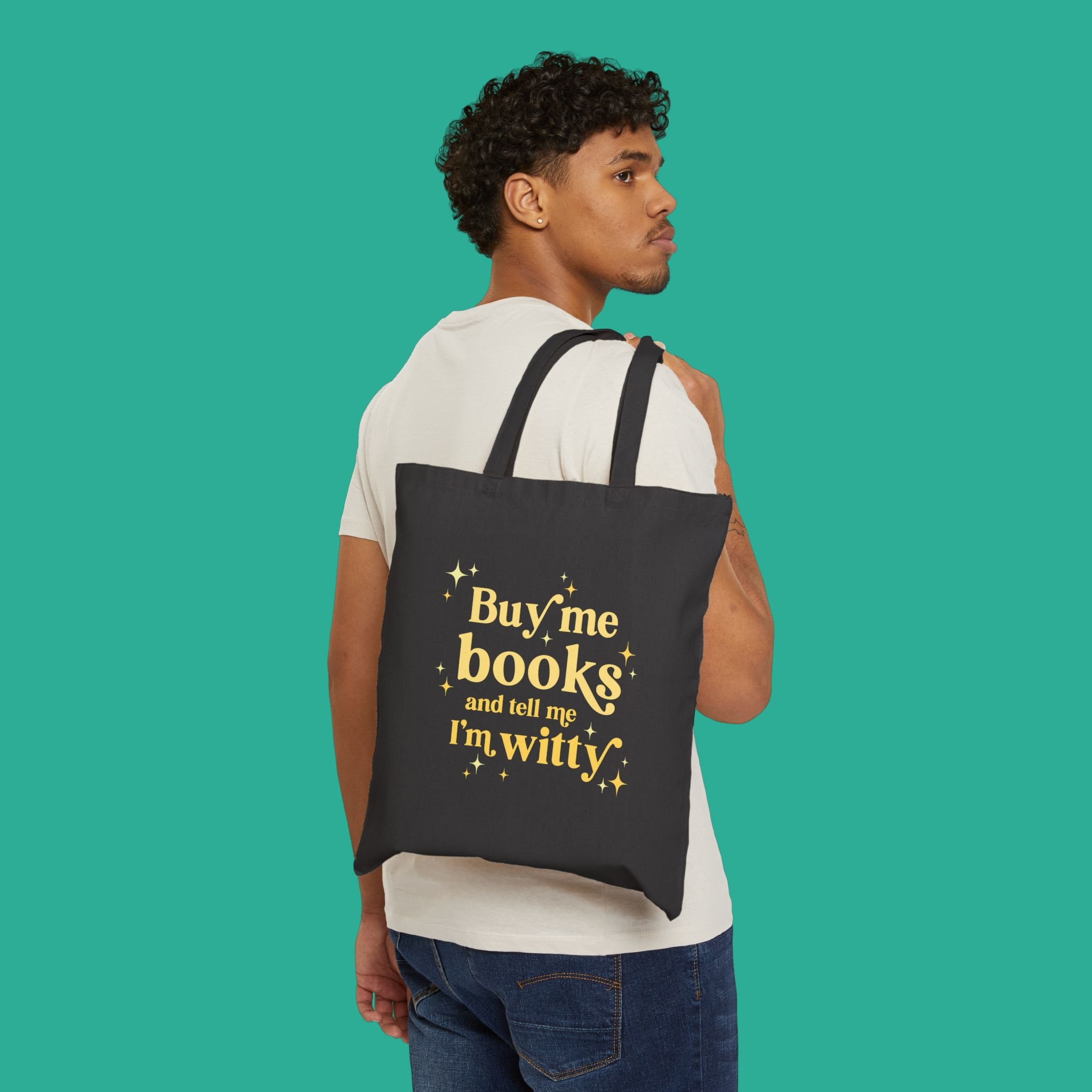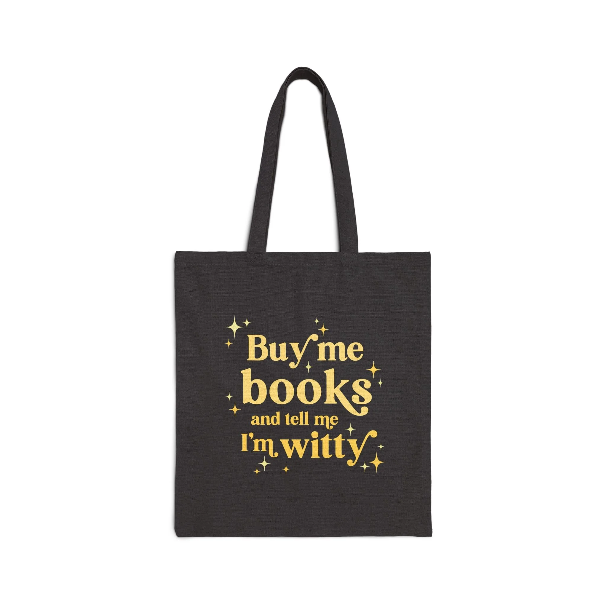 Because honestly, what could be better than a good compliment and a new stack of books? The Buy Me Books and Call Me Witty tote puts a playful spin on the old saying — perfect for readers who know that brains and humor are a far better match than dinner and roses.